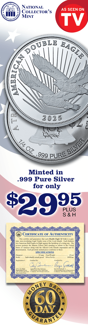 Today history is being made! The National Collector's Mint and the Cook Islands announce a limited release of the new Pure Silver 2025 Silver Double Eagle $2 Coin.